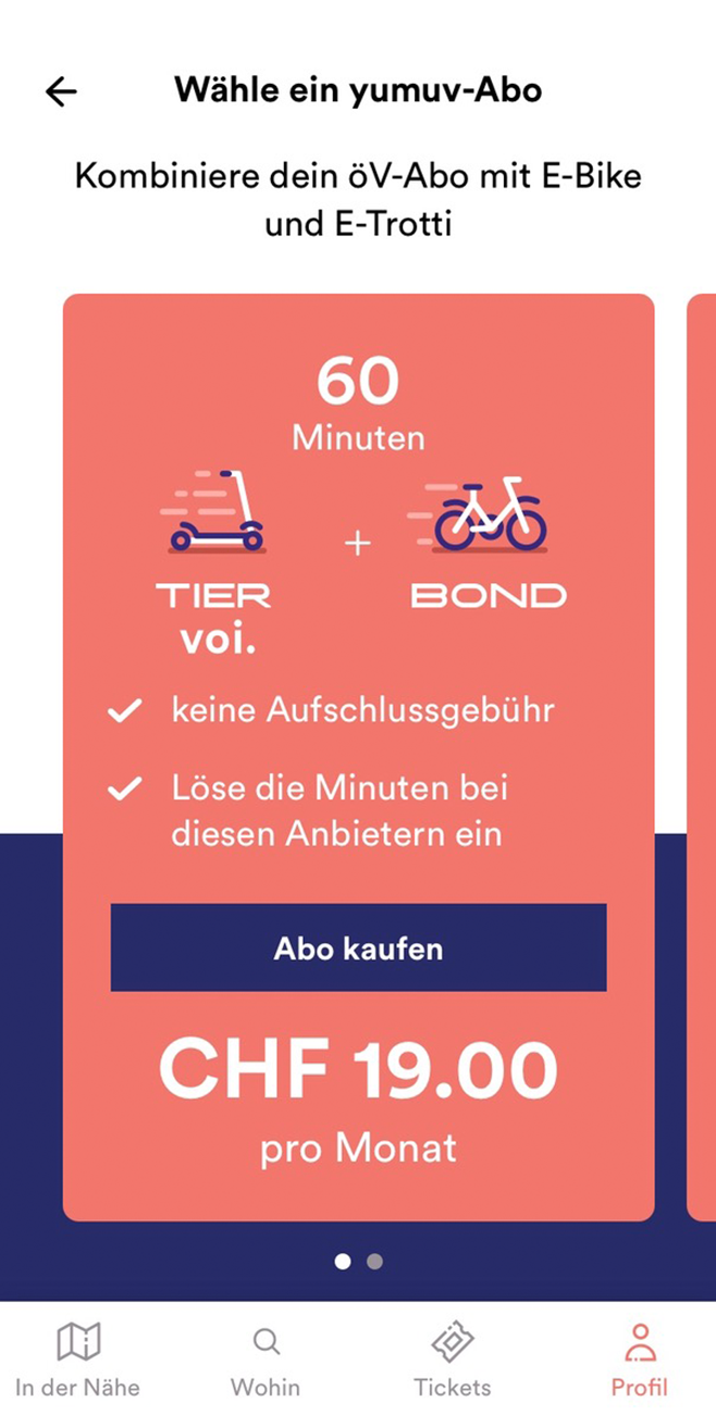 Mit yumuv erhältst du Zugriff auf öV, E-Bikes, Cargobikes, Carsharing und E-Trottis. Planen, buchen und nutzen – alles in einer App.